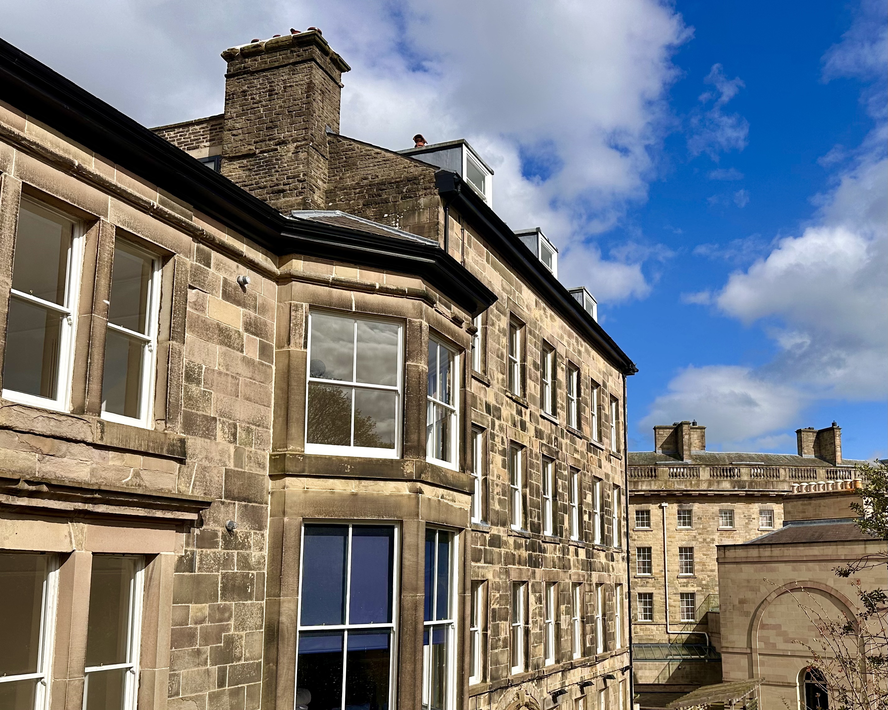 A grand staircase, with feature lantern rooflight, leads you to the entrance of the apartment which is located on the second floor. Upon entering you are greeted by an inviting open-plan living and kitchen space with high ceilings and large windows which afford beautiful views of central Buxton architecture and the hills beyond.