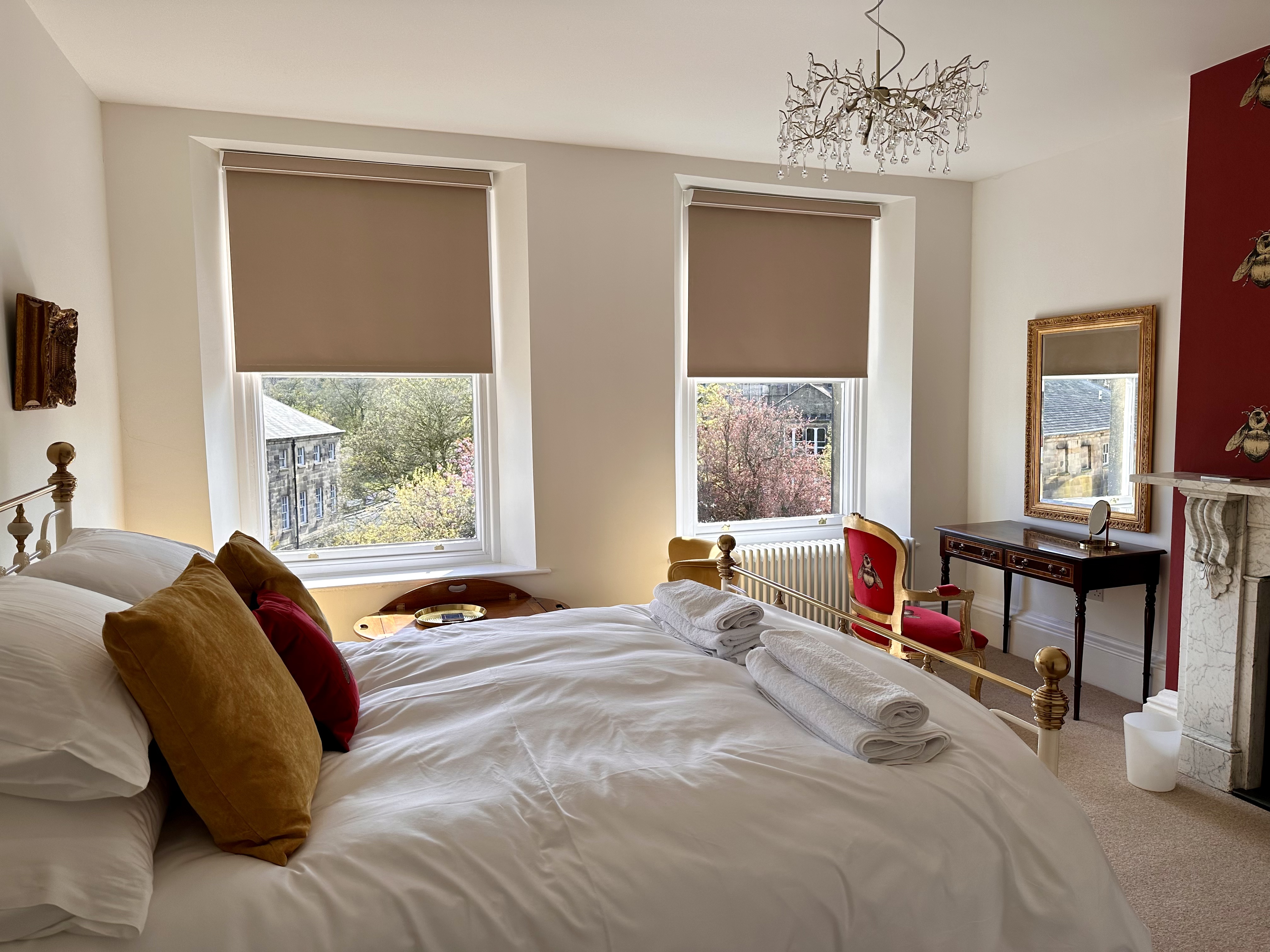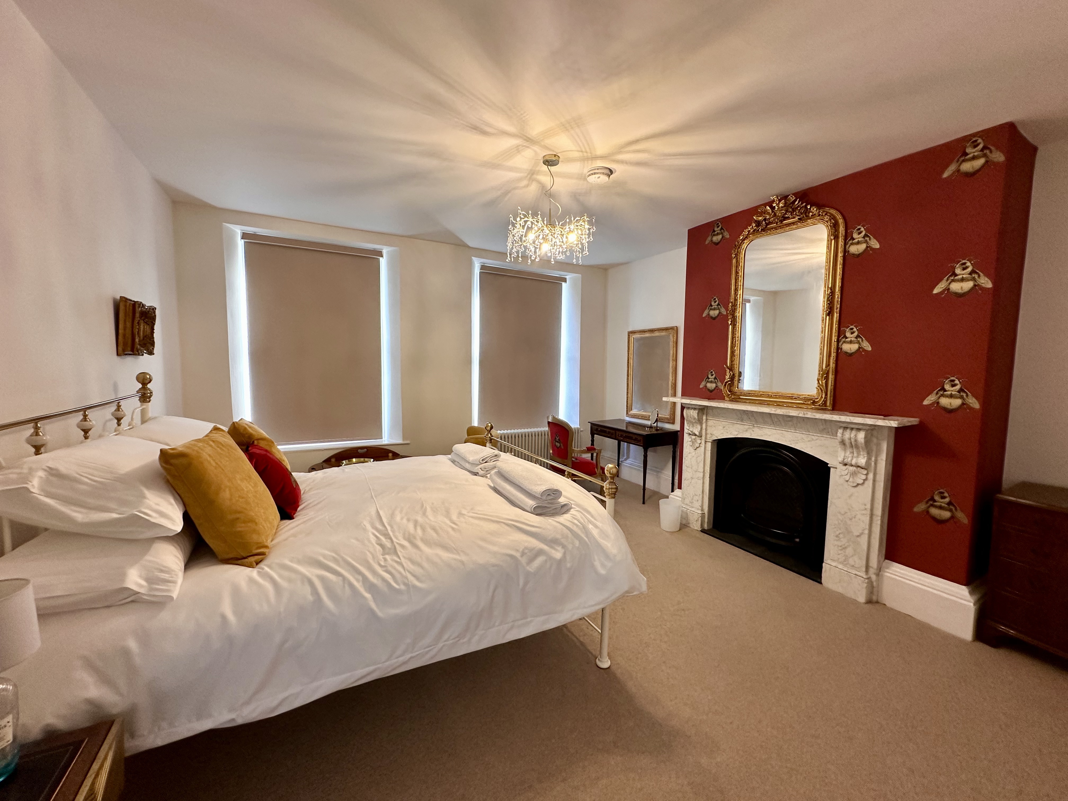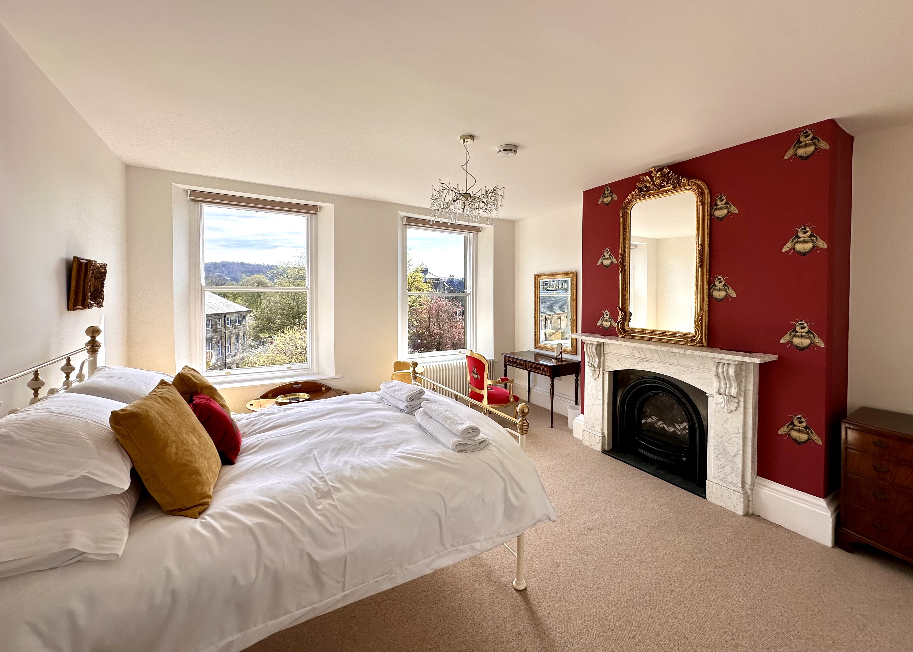 The bedroom features vibrant and luxurious furnishings with a comfortable king sized bed sitting opposite a magnificent, newly-restored marble fireplace (not operational), bringing a wealth of character to the room. The bed is decorated with stylish soft furnishings and both Egyptian cotton linens and towels are provided, as well as a hairdryer.