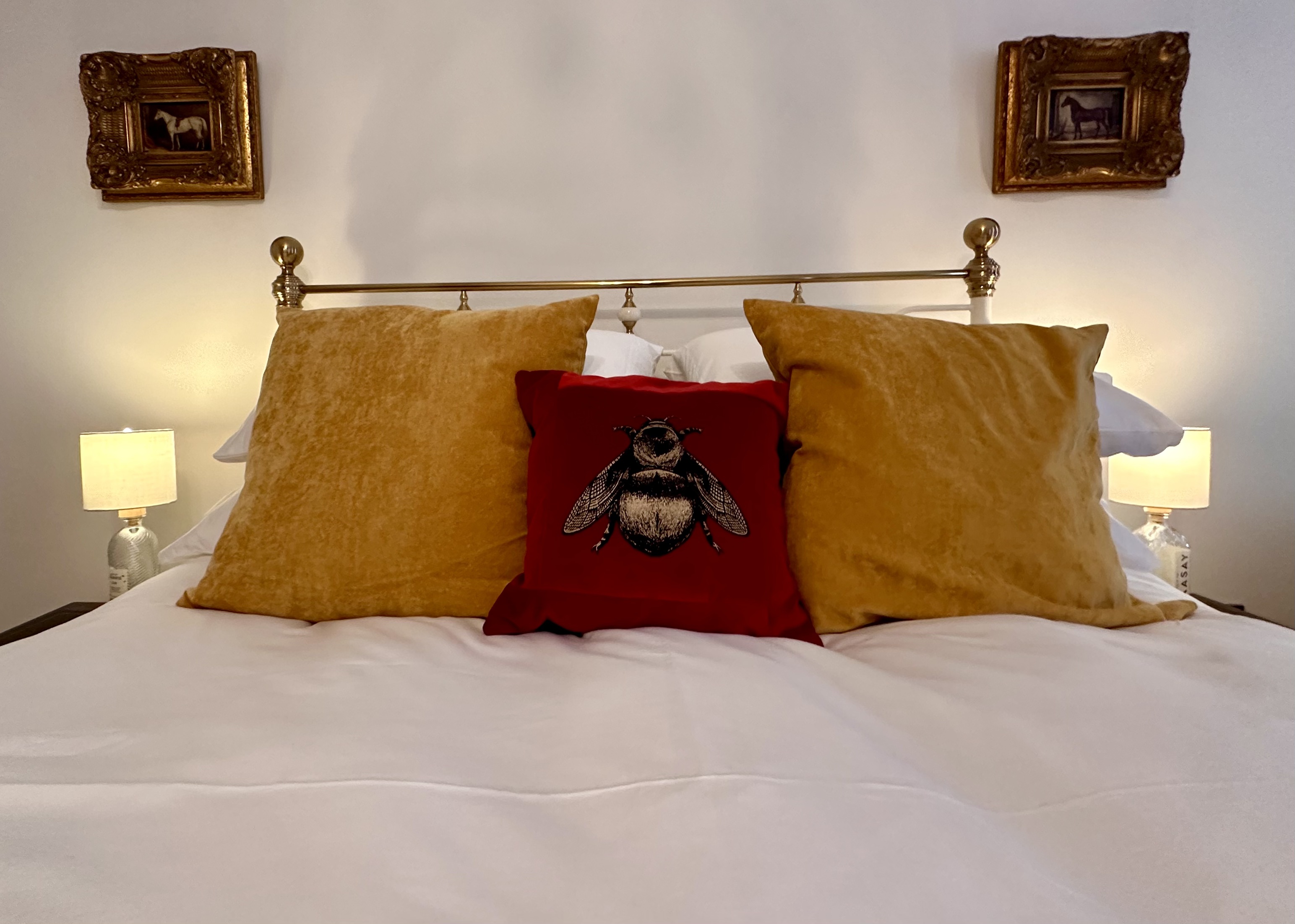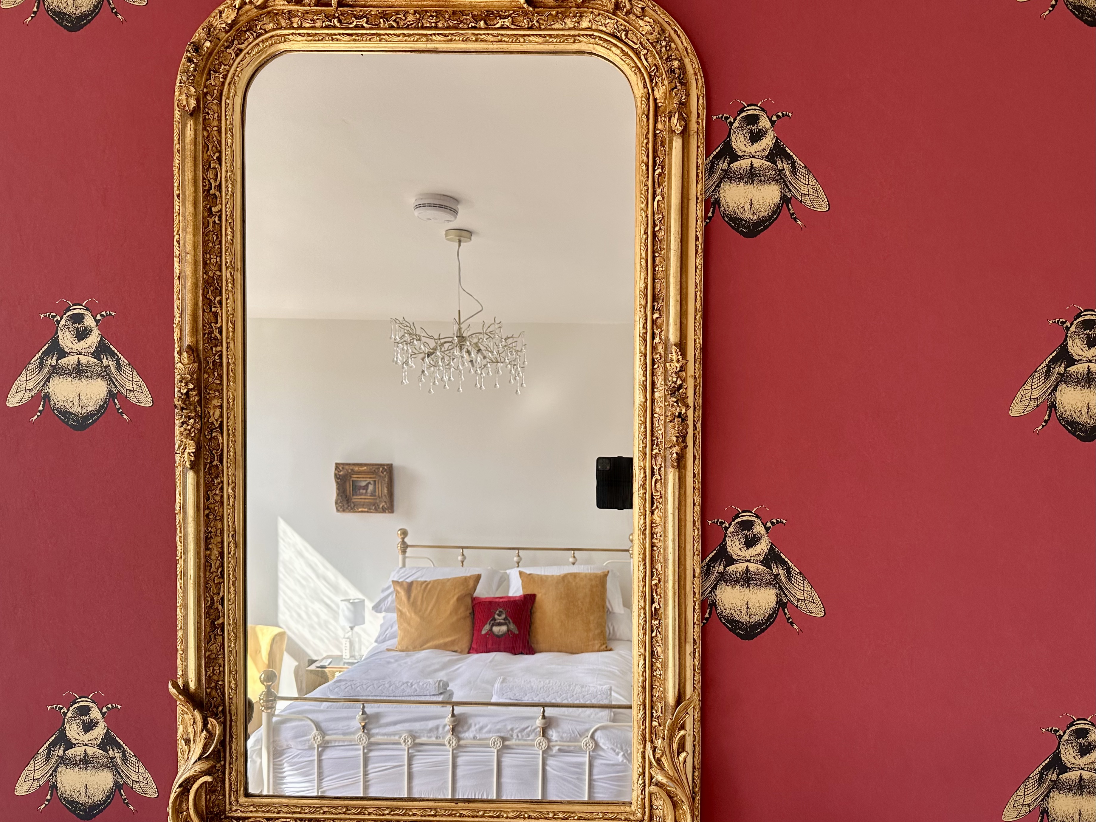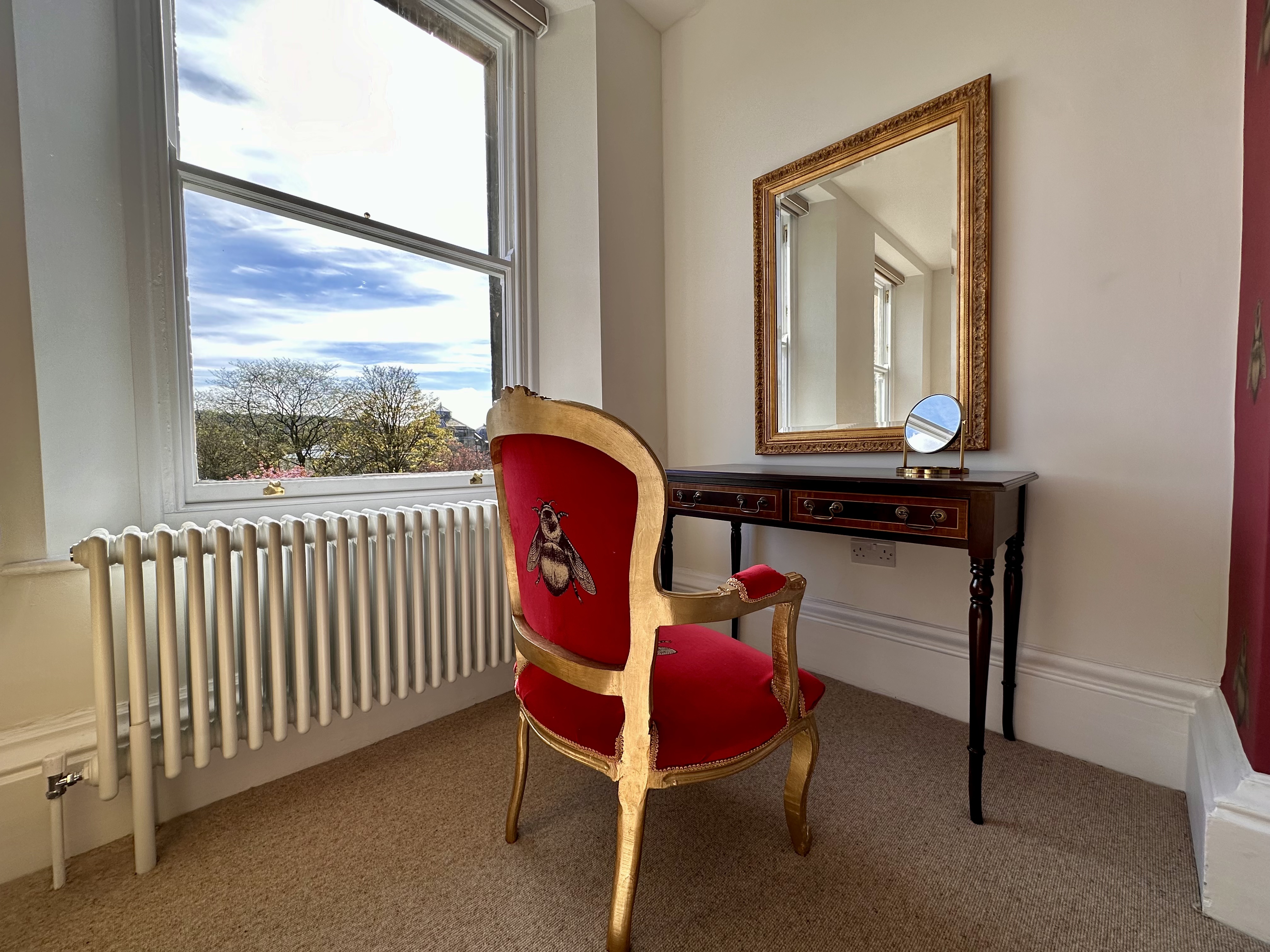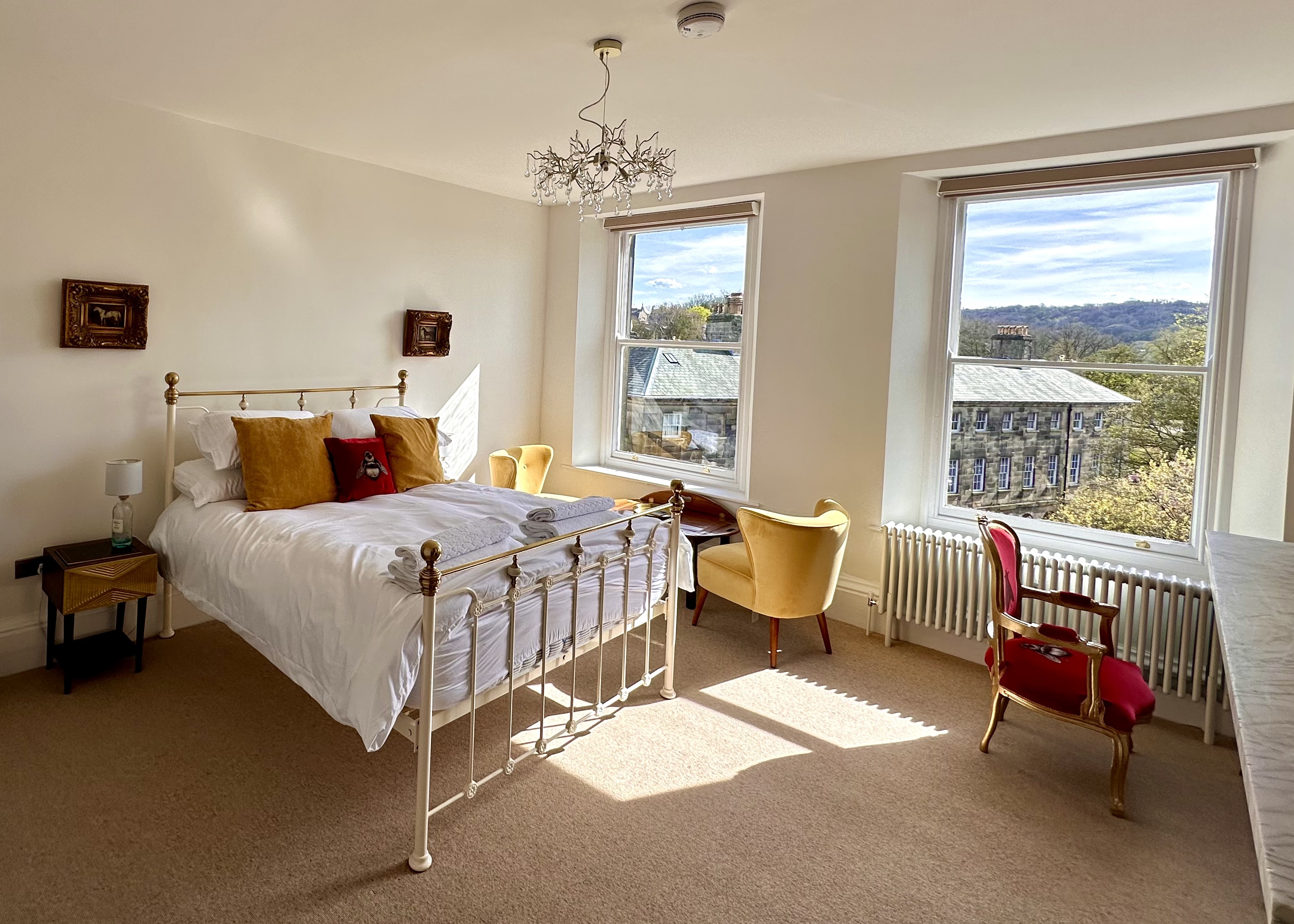 The bedroom features vibrant and luxurious furnishings with a comfortable king sized bed sitting opposite a magnificent, newly-restored marble fireplace (not operational), bringing a wealth of character to the room. The bed is decorated with stylish soft furnishings and both Egyptian cotton linens and towels are provided, as well as a hairdryer.